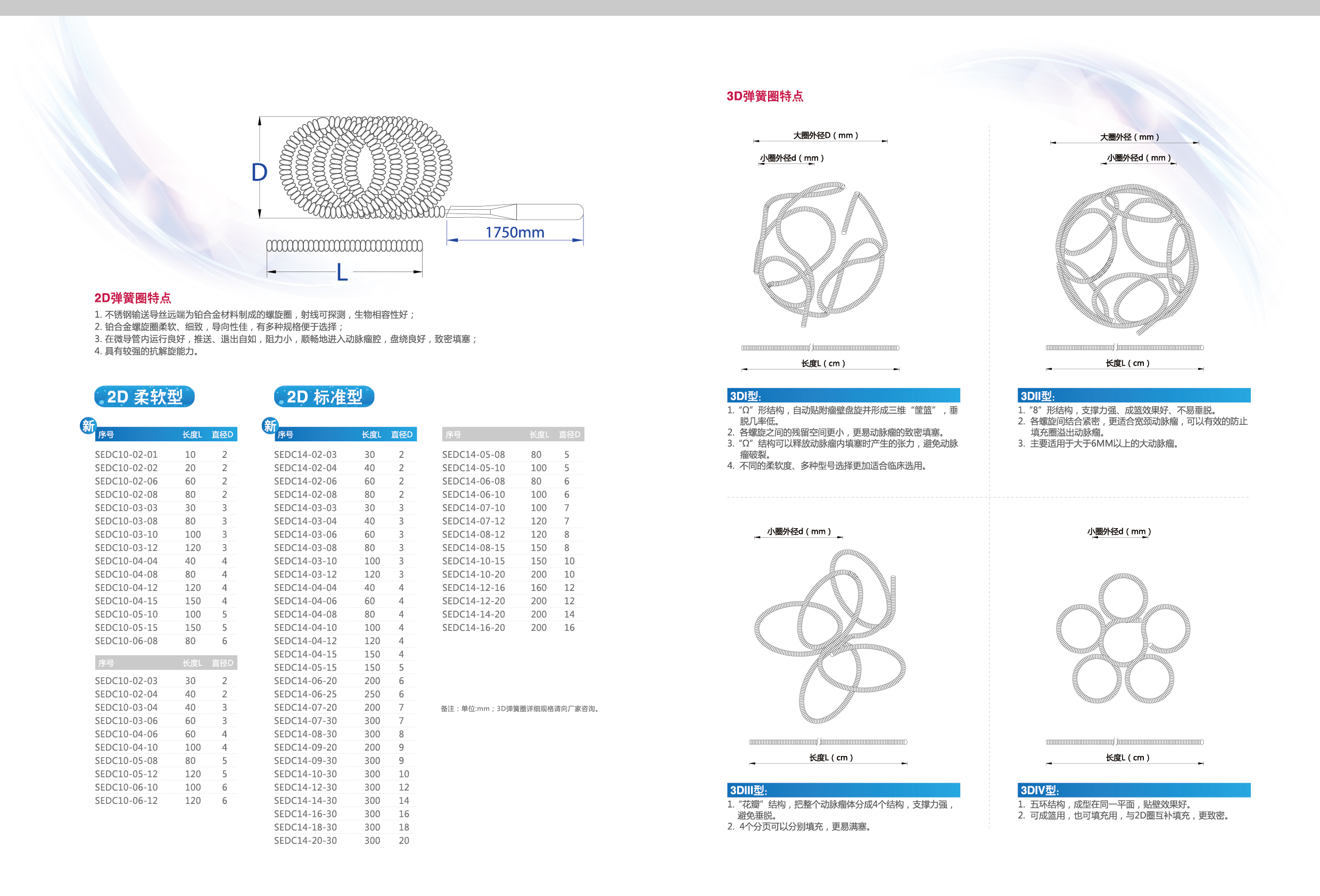 AlbucaTM弹簧圈系列产品采用——独特的制造工艺,解脱区域更短和更柔软,解脱点抗拉强度高,解脱时间短;——铂钨合金螺旋圈,生物相容性好,显影清晰,定位更准确;——1D/2D/3D型号齐全,性能优越,能满足临床使用需要。